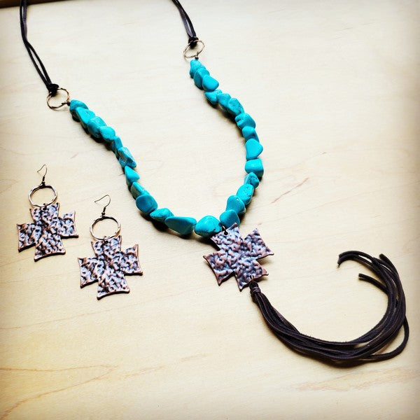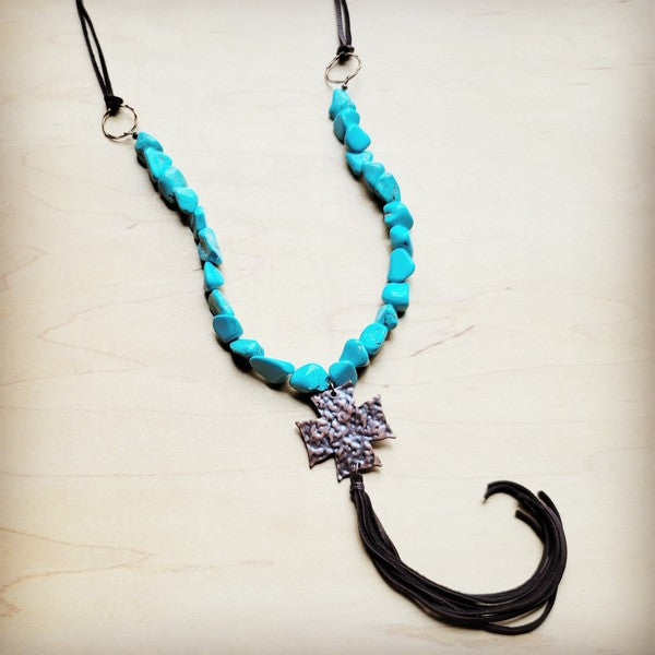 This handmade boho beaded necklace features genuine leather and beads, giving it a unique and bohemian style. The Magnesite beads add a touch of elegance, while the copper pendant brings a rustic charm. This necklace works well with any outfit and can be dressed up or down. Layer it with l boho shorter necklaces, pair it with some leather earrings, or wear it by itself as a boho statement necklace.