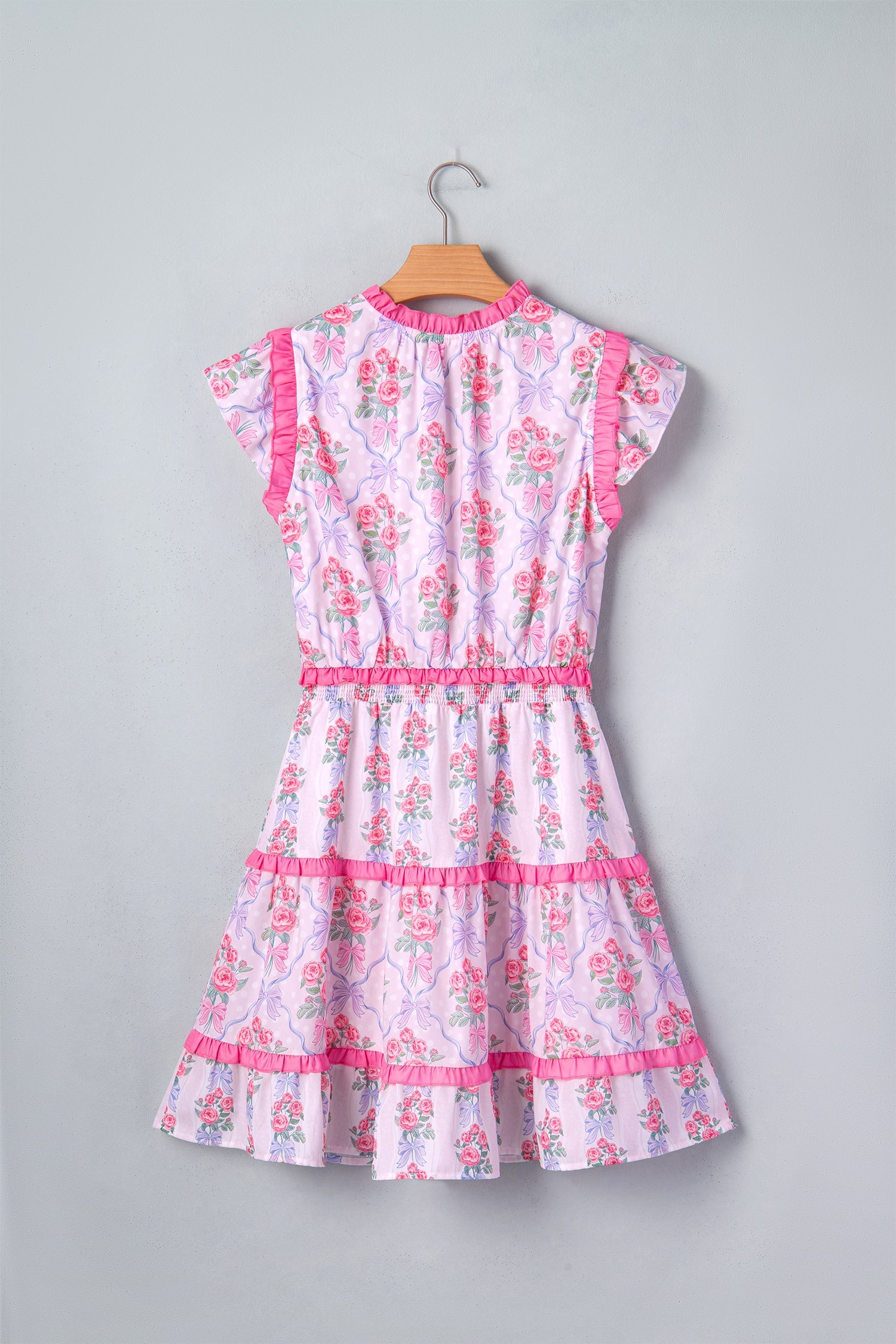 Embrace springtime charm in this adorable floral mini dress. Featuring a delicate coquette floral print with colorblock ruffled details, this sweet piece combines feminine style with playful flair. The flattering V-neckline, ruffle sleeveless design, and shirred waistline create a perfectly proportioned silhouette that's both comfortable and chic. Ideal for warm weather days, pair it with cute sandals for a casual vibe or dress it up with wedges for a more polished look. A versatile wardrobe essential that captures the essence of the season. 100% Polyester