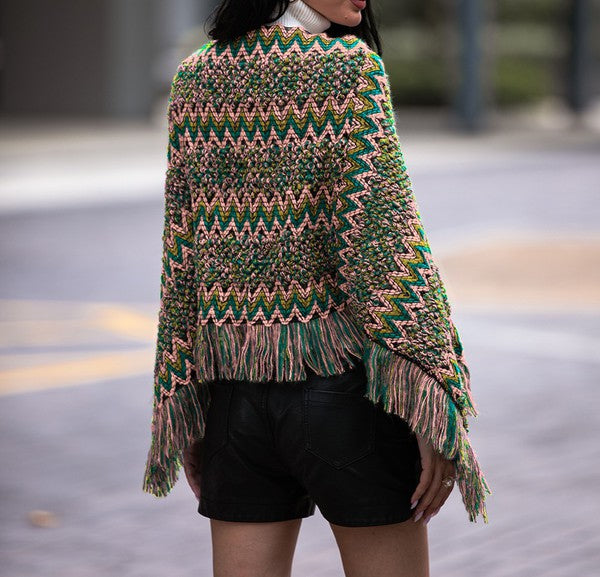 Green Fringe Trim Batwing Sleeve Poncho Sweater | Modern Boutique Fashion