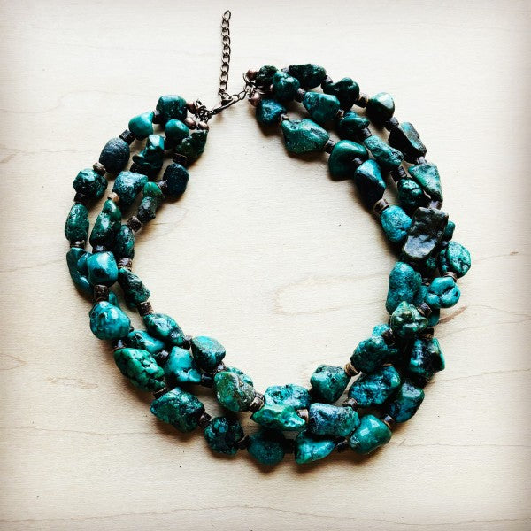 Expertly crafted with three strands of genuine turquoise and wood, this boho western necklace adds the perfect touch of natural beauty to any outfit. Each unique stone makes a one-of-a-kind statement. Dare to stand out with the Large Triple Strand Natural Turquoise Wood Collar Necklace.