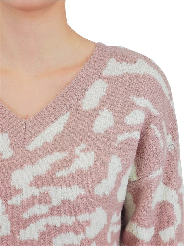 - Leopard Jacquard Patterned V-neck long sleeve loose fit pullover.