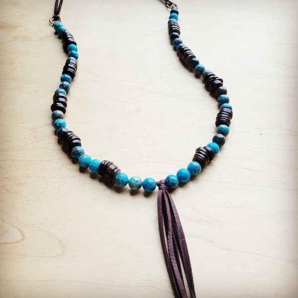 Ocean Agate Necklace w/ Wood Beads &Leather Tassel