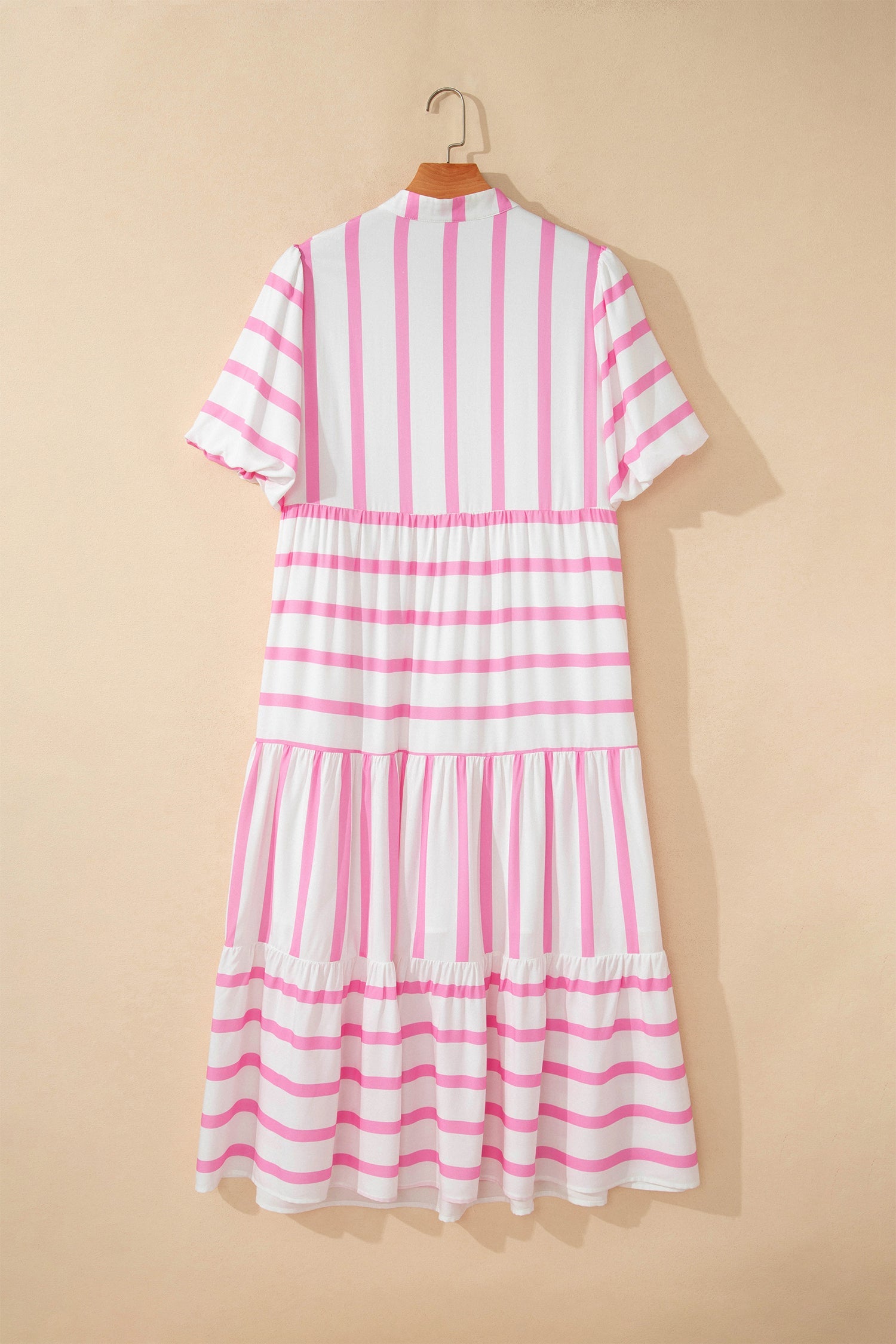 Embrace effortless elegance in this plus-size striped maxi dress designed for comfort and style. The classic V-neckline flatters your silhouette while creating a graceful, elongating effect. Delicate puff sleeves add a charming feminine detail, while the tiered construction provides beautiful movement and breathability for all-day wear. Perfect for casual outings, garden parties, or relaxed evenings out. 100% Viscose