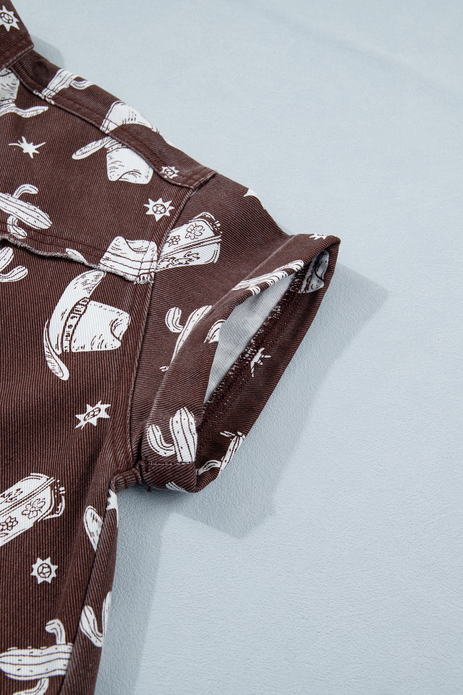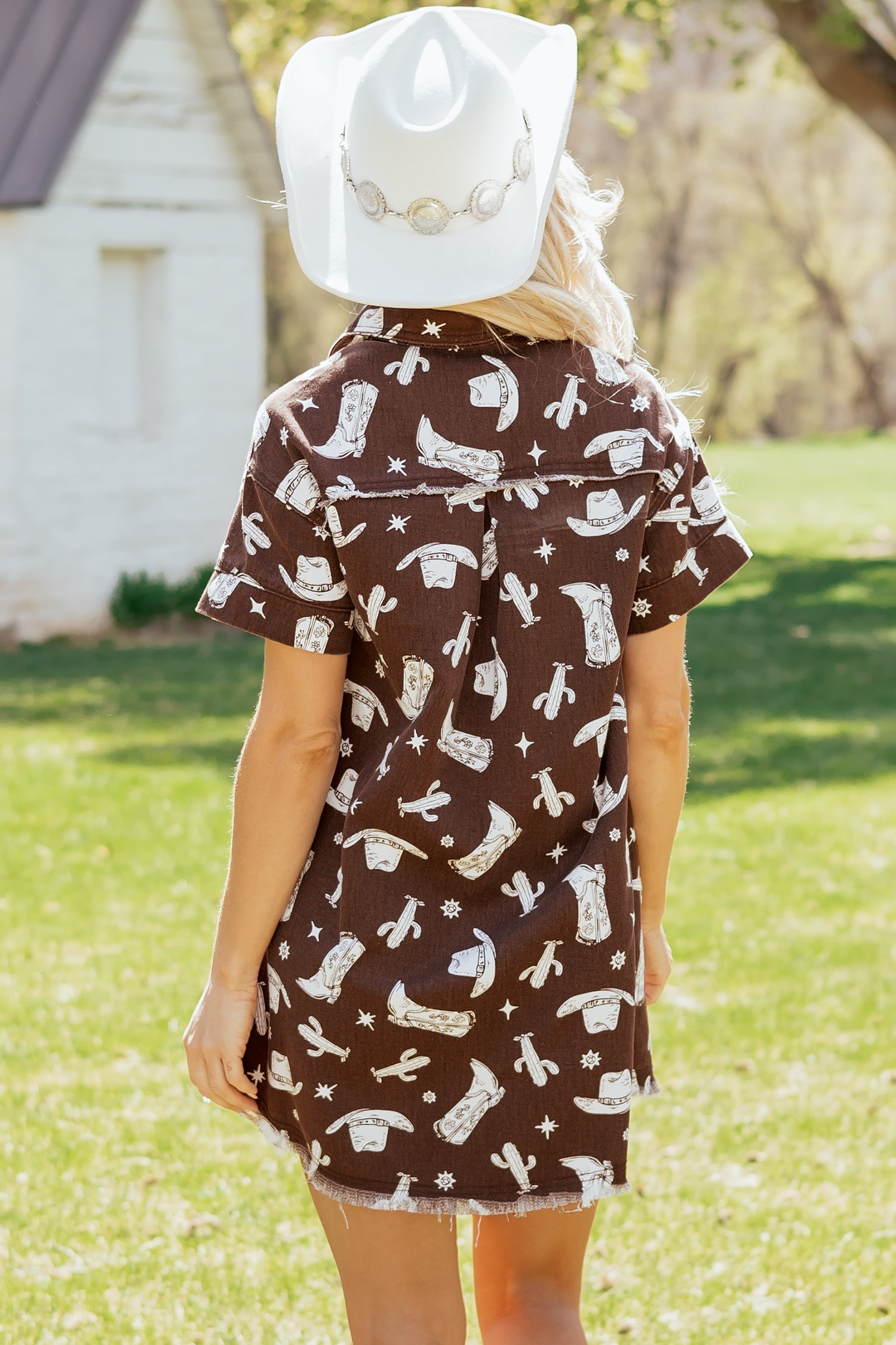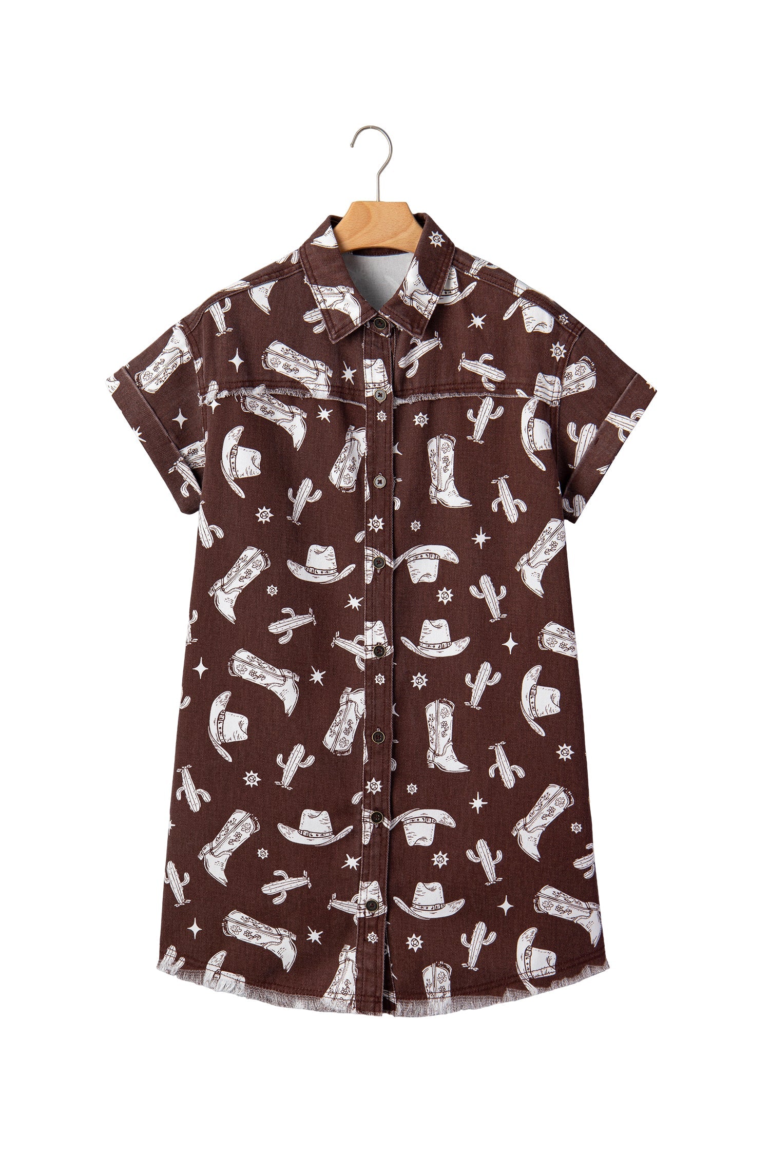 Saddle up in western style with this short denim dress, featuring an exclusive cowgirl hats, boots, and cactus print that brings authentic frontier flair to your wardrobe. Crafted from durable denim fabric, this timeless piece combines classic appeal with modern edge, literally. The raw edge design adds fashion-forward charm while the short sleeve button-down shirt style keeps it perpetually on-trend. Perfect for anyone who loves bold patterns and a touch of the wild west. Cotton/Polyester